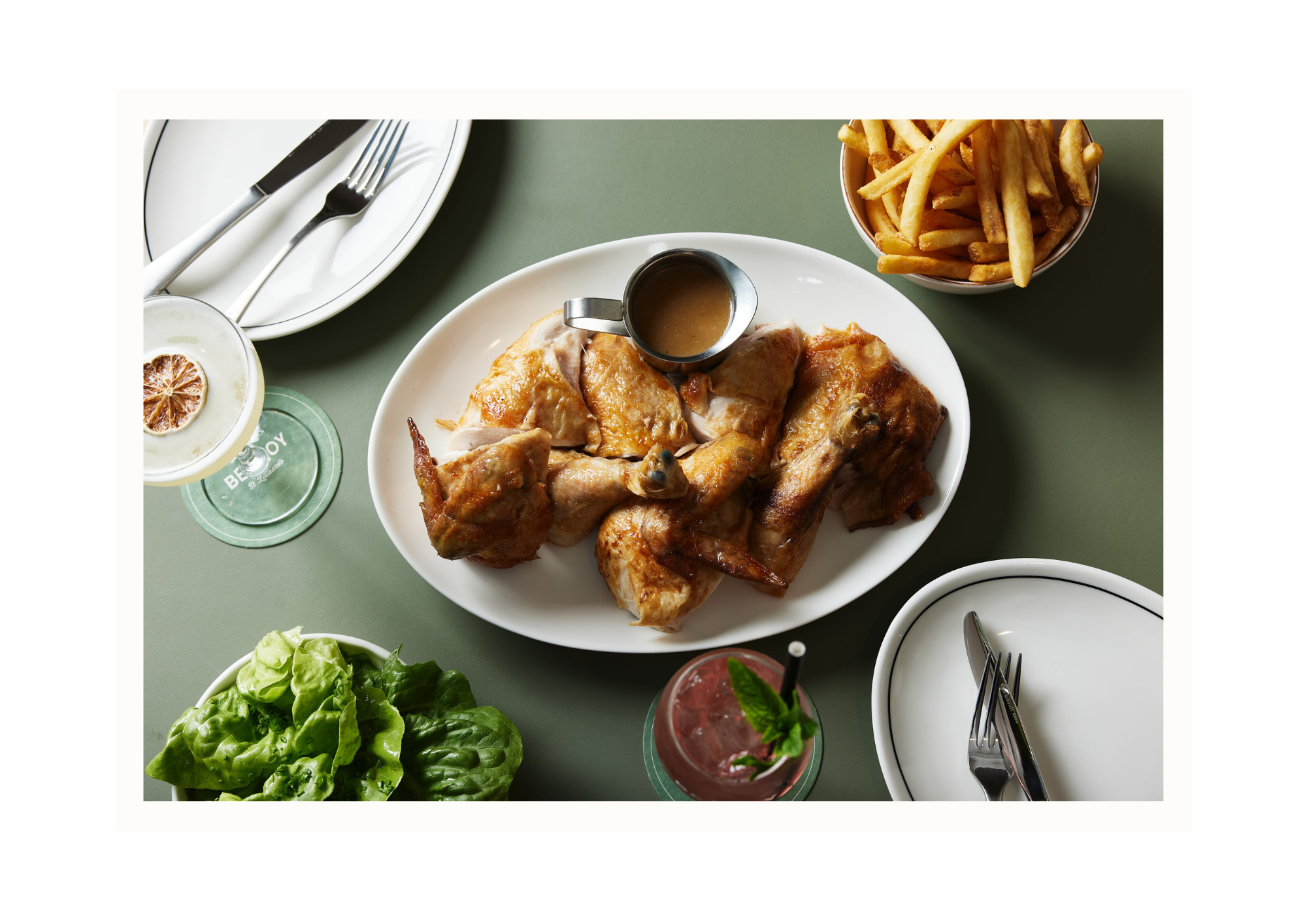 Every morning we fire up our rotisserie, ready to roast up plump, juicy, perfectly-seasoned chickens for our menu. Get yours for lunch or dinner, served with crispy fries, a butter leaf salad and rich chicken gravy.